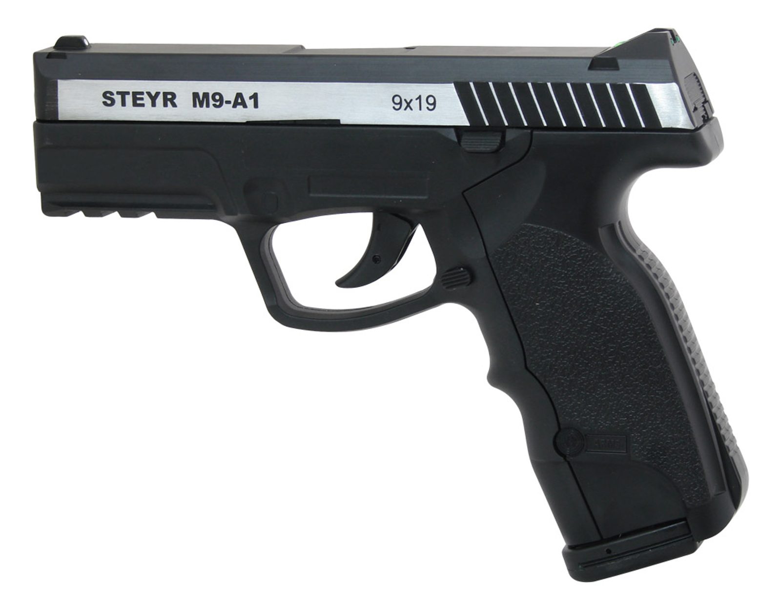 Vzduchová pistole Steyr M9-A1 bicolor je věrnou kopií reálného modelu Steyr Mannlicher M9-A1, který je vyráběn dánským výrobcem ASG na základě zakoupené licence rakouského výrobce Steyr. Pistole je vybavena pojistkou proti nechtěnému výstřelu a světlovodnými mířidly Tru-Glo, stejně jako reálný model. Vnitřní součásti jsou vyrobené ze slitiny kovů, tělo je z větší části z polymeru odolného proti poškrábání. Bombička se vkládá do pažbičky, stejně tak jako kovový zásobník na ocelové 4,5mm BB broky, který lze také dokoupit samostatně. Vynikající a odolná zbraň pro rychlou destrukční střelbu BB broky s jednoduchou obsluhou a manipulací.