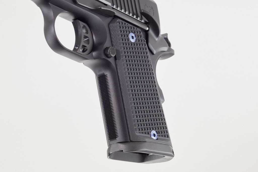 Dalším prvkem, který je součástí tohoto modelu, je ultra vysoký podříznutý lučík spouště, takže většina velkých rukou se stále vejde na rukojeť. Nakonec tu máme střenky z materiálu G10, které byly pro tuto pistoli vyrobeny na zakázku s Railscales a „jsou tenčí než nejtenčí rukojeti 1911 dostupné na trhu“.
