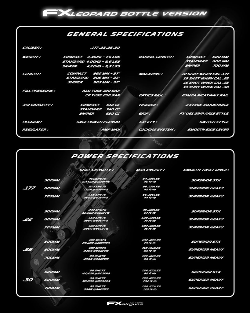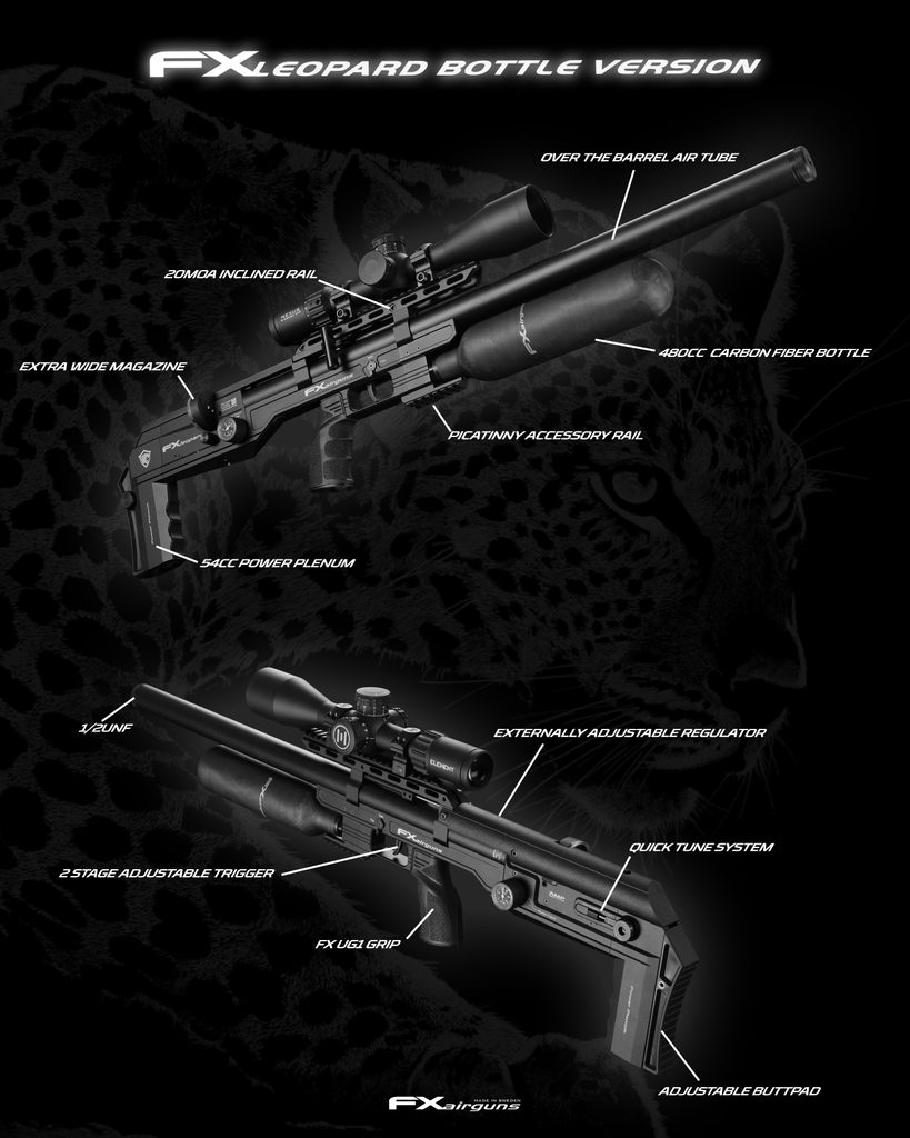 Leopard kombinuje to nejlepší z všech posledních modelů vzduchovek FX. Kartuši okolo hlavně, detailně a snadno nastavitelný výkon, externě nastavitelný regulátor, sportovní nastavitelnou spoušť, pogumovanou rukojeť v AR stylu.